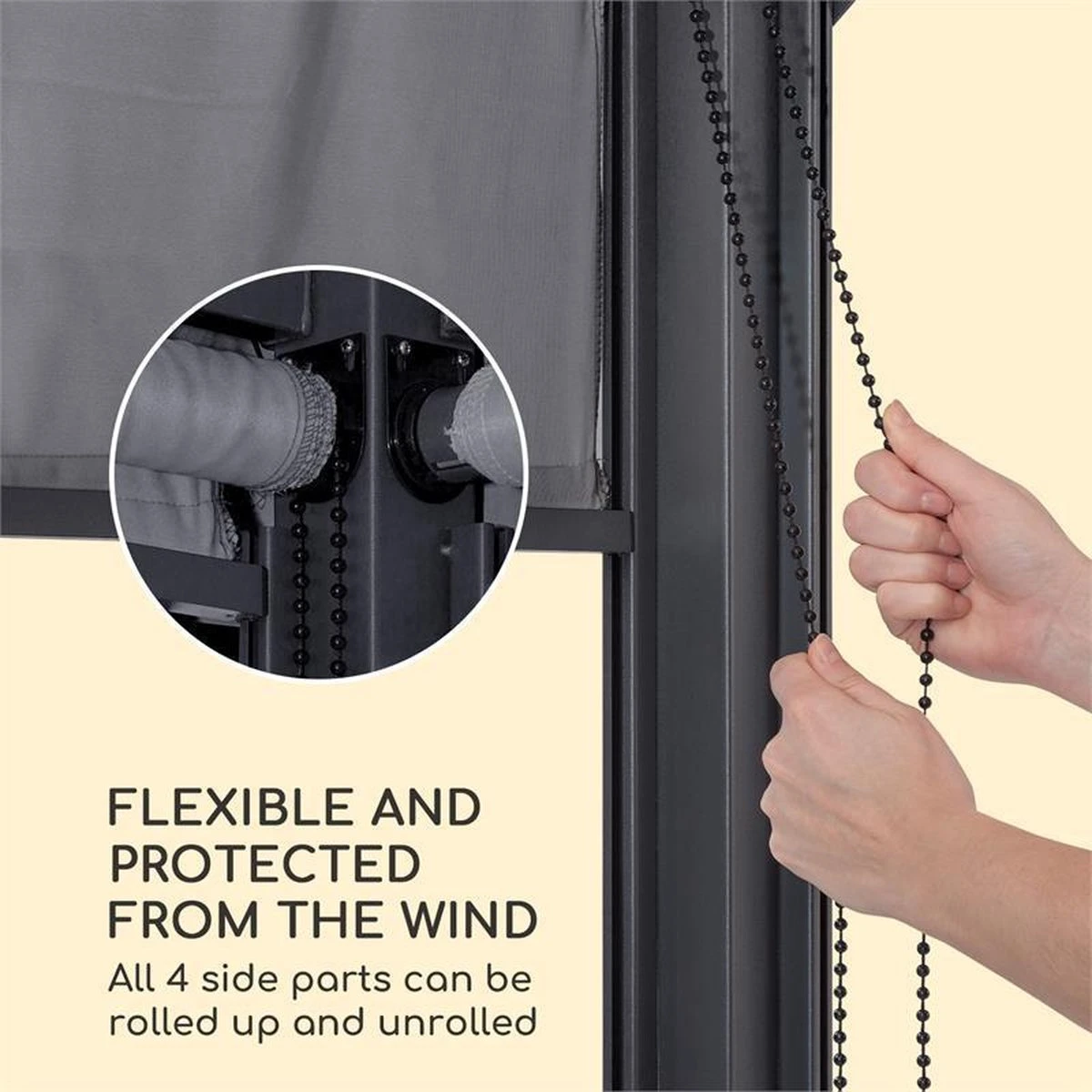 De zomer in de openlucht genieten – bij wat voor weer dan ook! Het Blumfeldt Grandezza Cortina tuinpaviljoen is een luchtige schaduwplek en weerbestendig refugium ineen.Nu aangename uurtjes met vrienden en familie in de tuin doorbrengen: met een overdekt oppervlak van 3 x4 meter biedt de Grandezza Cortina veel ruimte ter ontspanning onder een weelderig dak van 180 g polyester met waterafstotende en schimmelbestendige laag. Het 6 x6 cm stevige stalen frame garandeert bovendien maximale stabiliteit en is dankzij zijn laag poederlak beschermd tegen roestvorming.Bijzonder bij schuin invallende zonnestralen, wind of regen komen de 4 flexibel zijstukken van pas, die per stuk met een gemakkelijk af- en oprolmechanisme geopend en gesloten kunnen worden en van 160 g wasbaar polyester zijn vervaardigd. Bij opbouw van de constructie is het aan te bevelen op een bijzonder loodrechte verankering van de poten in de grond te letten om zo het gelijkmatig af- en oprollen zonder kreukels in de plooien te garanderen.Schaduwbezorger op hete zomerdagen en betrouwbare bescherming tegen wind en regen: het Grandezza Corina tuinpaviljoen van Blumfeldt.