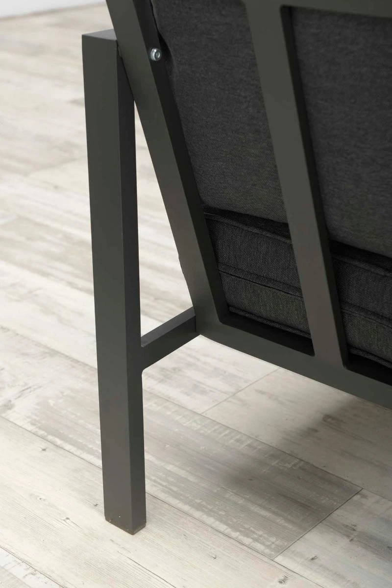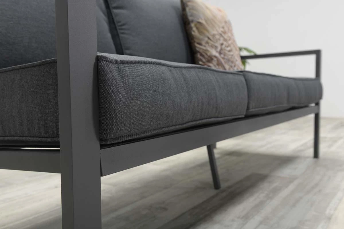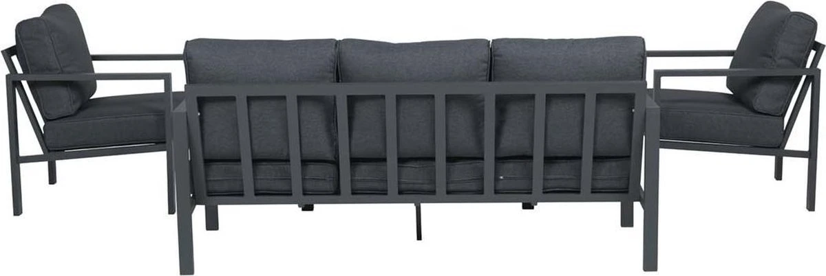 De set bestaat uit een driezitsbank met koffietafel en twee stoelen. Het frame van de set is gemaakt van aluminium met een beschermende poedercoating. Aluminium is uitermate geschikt voor gebruik buitenshuis, omdat het eenvoudig te onderhouden, gemakkelijk schoon te maken is en een moderne uitstraling heeft. De dikke loungekussens worden standaard meegeleverd en hebben een waterafstotende coating. Water van een korte regenbui kun je eenvoudig van het kussen af kloppen. Mocht je de kussens een niet gebruiken, dan raden wij aan deze schoon en droog op te bergen.