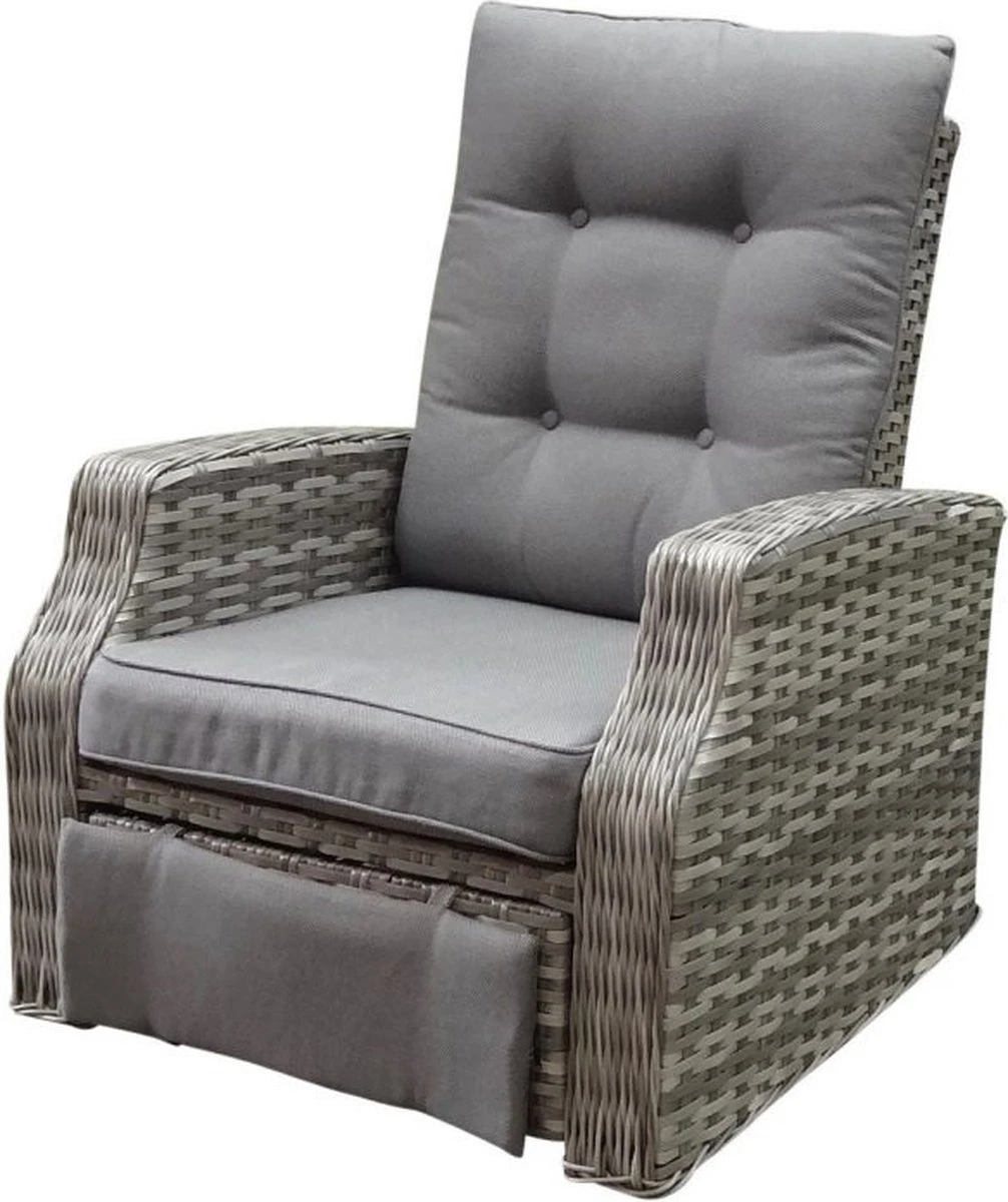 De Kreta draaibare stoel is onderscheidend ten opzichte van andere loungestoelen door de draaipoot. De lounge stoel geeft u de mogelijkheid om met de zon mee te draaien, zonder de stoel te verplaatsen! De stoel is voorzien van een gasveer waardoor de rugleuning heerlijk achterover kan. Ook heeft de stoel een verstelbaar voeteneind. De kussens zijn donker grijs en het vlechtwerk licht grijs.