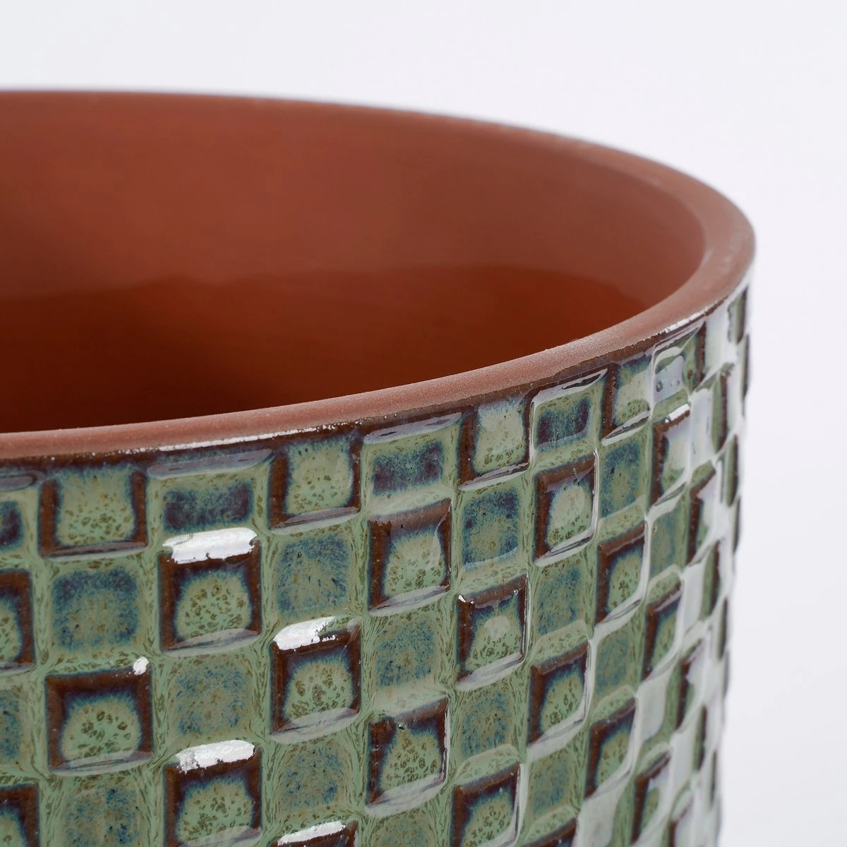 Bloempot Daan uit de collectie van Mica Decorations fleurt je interieur in een mum van tijd op. De keramieken pot is namelijk speels afgewerkt met een patroon van kleine vierkantjes. Erg mooi in combinatie met de subtiele glans! Daarnaast heeft de pot een frisse groene kleur die het vrolijke karakter alleen maar weet te versterken. Welk plantje zet jij erin? De Daan potten zijn verkrijgbaar in verschillende kleuren en maten. Leuk om met elkaar te combineren! Deze bloempot is groen en heeft een afmeting van H17,5 x Ø19 cm.