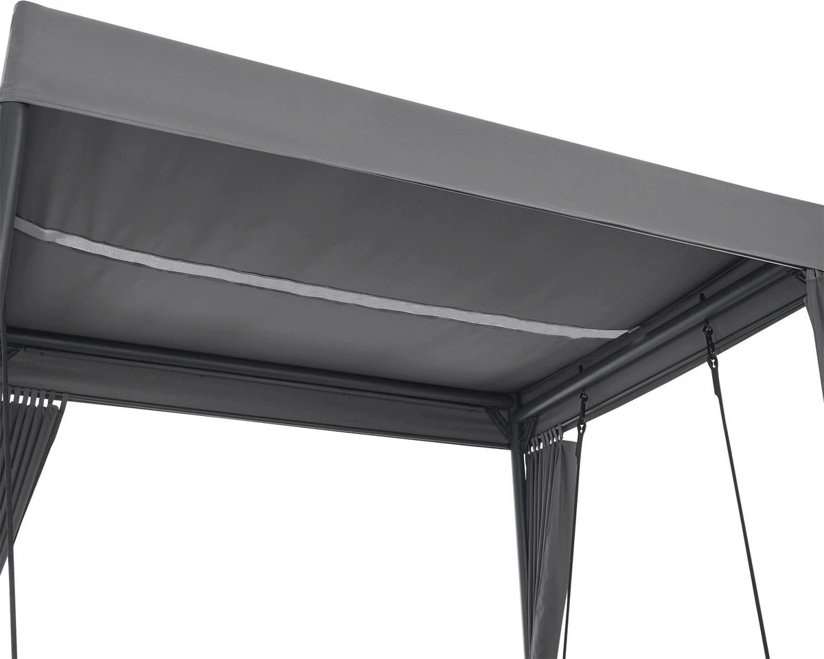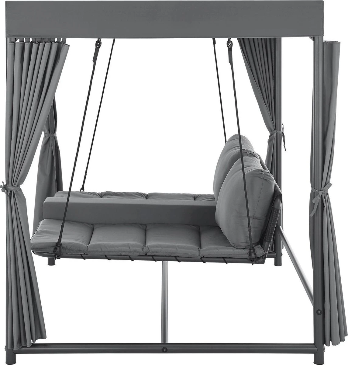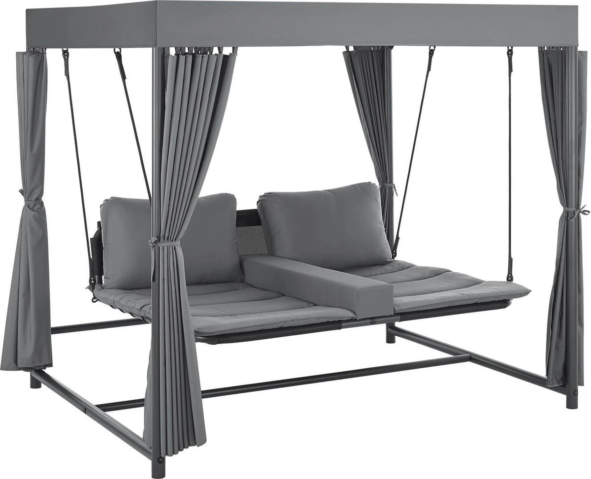 Het elegante schommelbed Kassandra is het nieuwe middelpunt van je tuin om je voeten op te leggen en te genieten van de zomer. Ontworpen in de stijl van een Balinees bed, zorgt het voor ontspannen schommelen dankzij het vrij hangende ligvlak. Modern en exotisch, zoals op vakantie in de Stille Zuidzee, zal deze tuinligstoel een blikvanger zijn in elke wellness-oase. Het dak en de gordijnen aan weerszijden zorgen voor veel privacy en beschermen tegelijkertijd tegen te veel zon en lichte wind. Ontworpen voor 2 personen, kunt u samen ontsnappen aan het dagelijkse leven en wegzweven als op wolken.